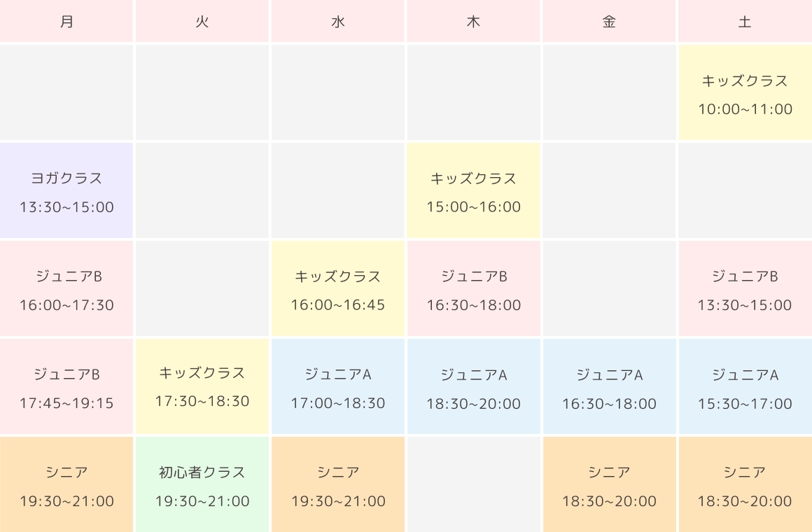 幅広いクラスをご用意3歳から入会することができ、キッズクラスやシニアクラス、ヨガクラスなど幅広いクラスがあり、子供から大人まで通って頂けます。
